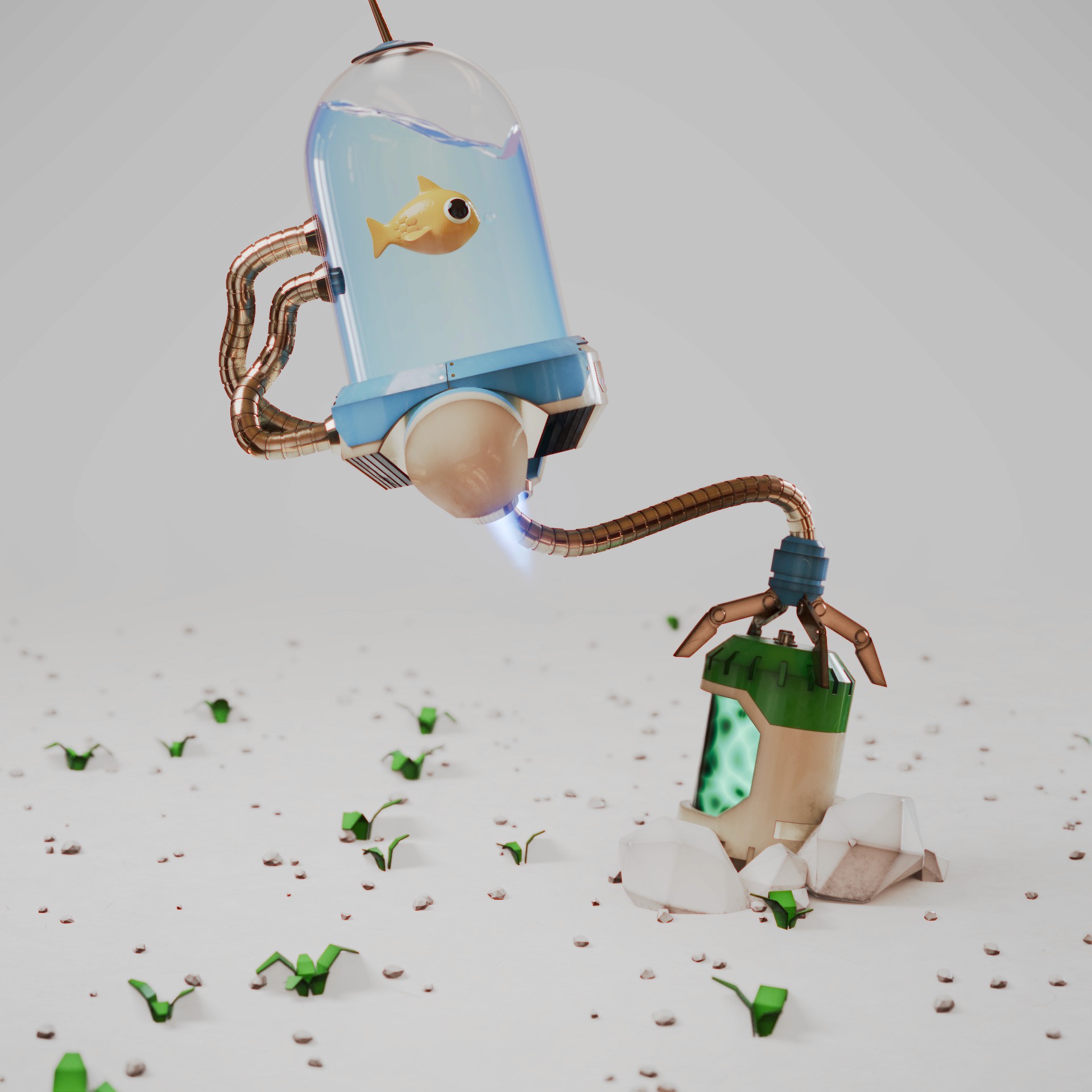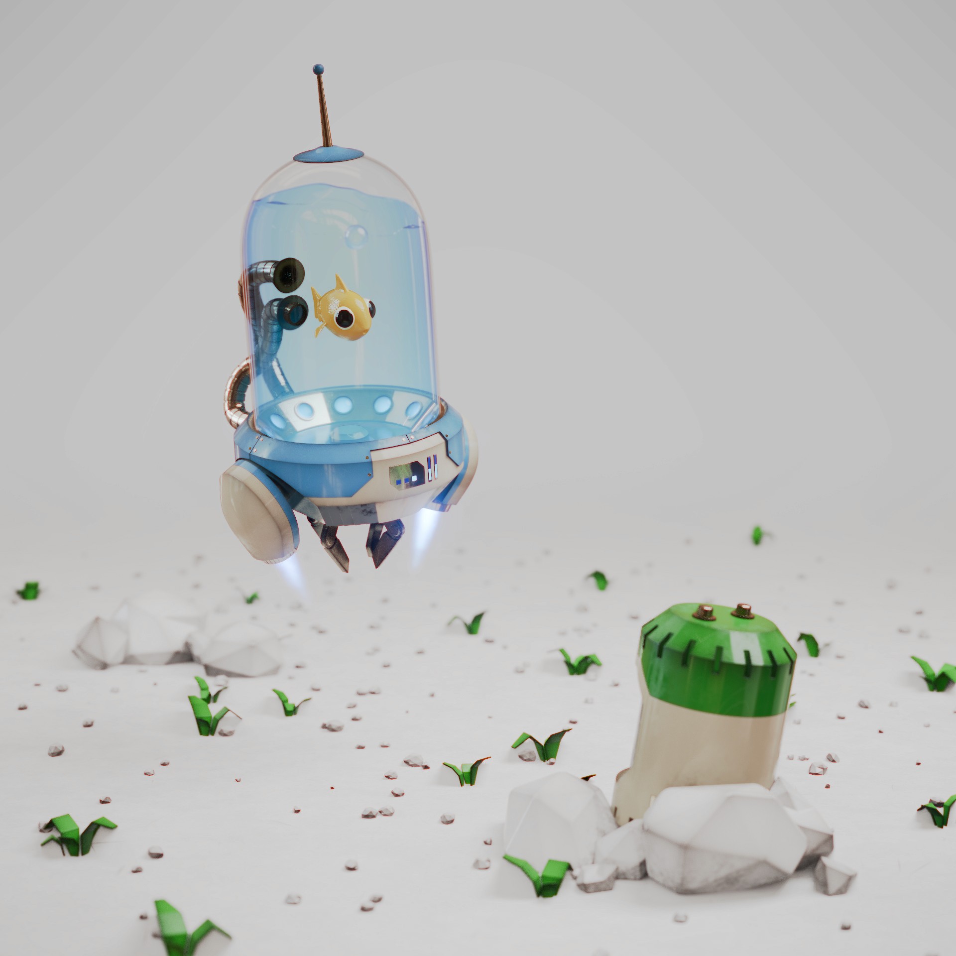 A small collection of personal 3D projects titled "Robotic Planet", created during a Blender animation course.